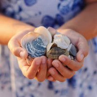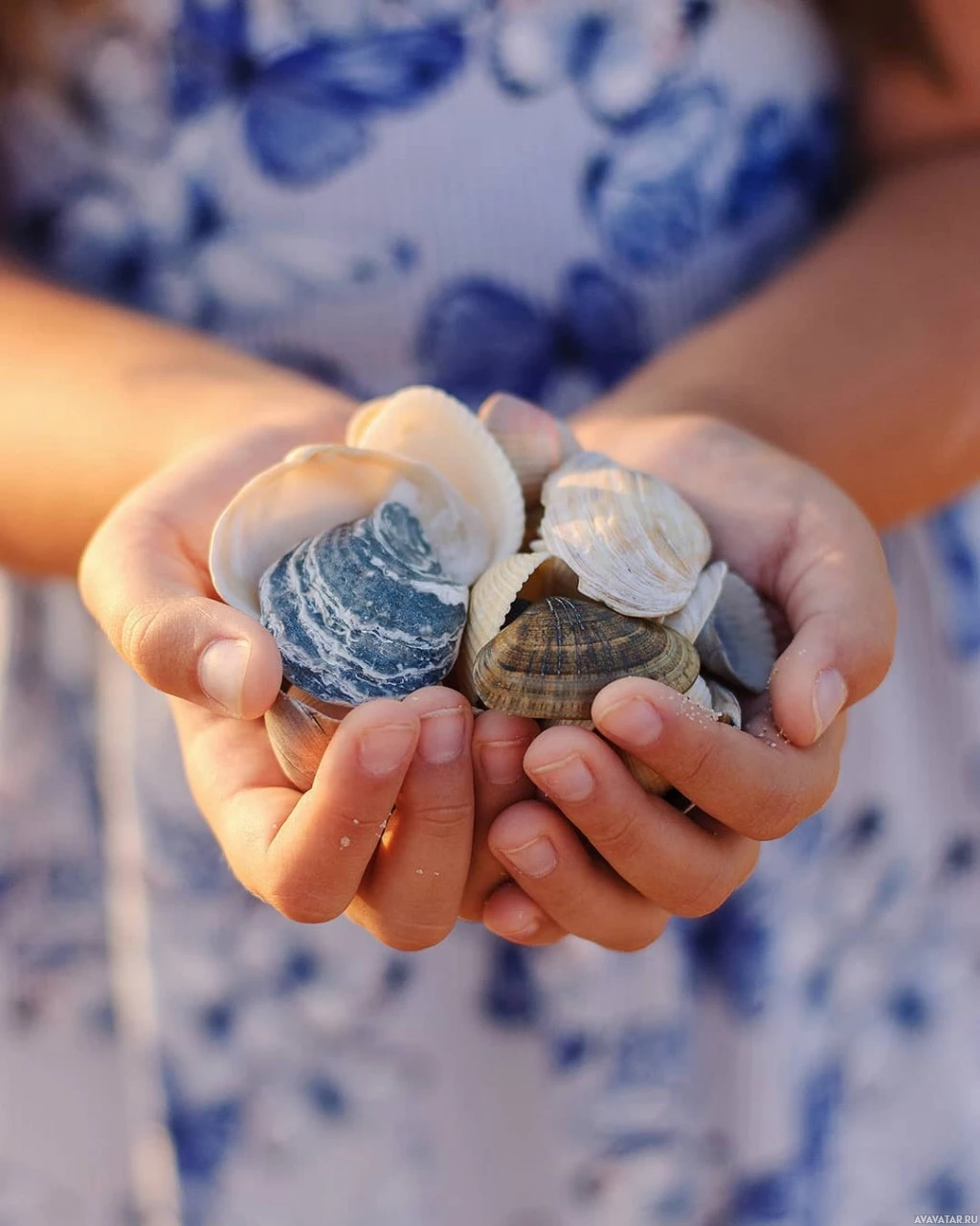 На снимке изображена пара рук, держащих небольшие раковины и морское стекло. Эти предметы часто собираются с береговых линий, что указывает на то, что человек может наслаждаться морской деятельностью или ценить прибрежные находки.