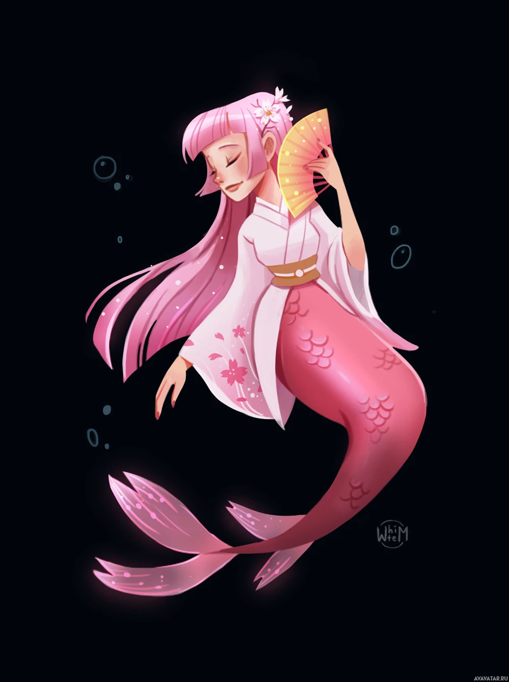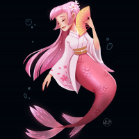 pink hair, is wearing a traditional Japanese-style outfit with a flower in her hair, and appears to be sitting on the ground while looking away from the viewer. The background features underwater elements like bubbles and fish, which complements the mermaid theme.