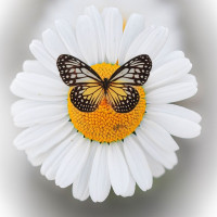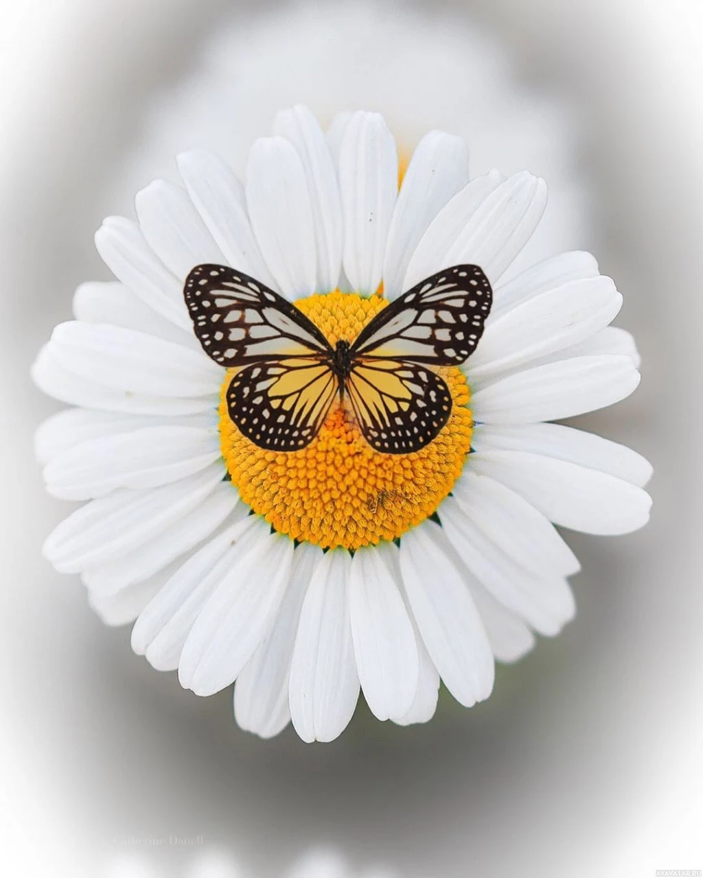 На картине изображен крупный план цветка с телом бабочки сверху. Это создает иллюзию, что бабочка выходит из центра ромашки, как хризалис, превращающийся в бабочку. Бабочка и ромашка являются основными элементами этого изображения, захватывая внимание зрителя своими контрастными цветами и подробными узорами.