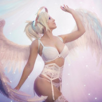 The image shows a character who appears to be Mercy from the video game Overwatch. She is styled as an angelic figure with wings and celestial attire. It's important to note that this image may have been digitally altered or artistically created to portray her in such a form.
