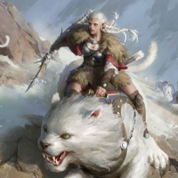 a fantasy scene where an elf, identified by the pointed ears and fantastical attire, is riding on the back of a large, white wolf-like creature. The elf appears to be in