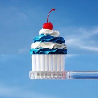 a piece of candy, which resembles a cherry or a gumdrop from the Willy Wonka movies, on its bristles. The background is clear and blue, suggesting