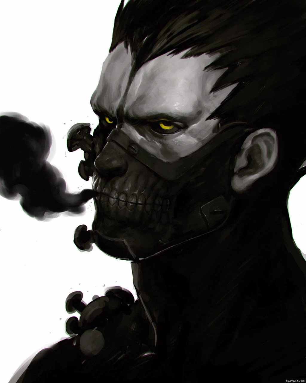 The image depicts an illustration of a character wearing a mask. The mask covers the entire face, except for one visible eye. This gives the impression that the mask is also part of a costume or a piece of armor with a skull-like design, which is often associated with themes like horror, fantasy, or
