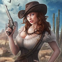 The image features a character designed to look like she is from the Wild West era, complete with cowboy hat and outfit. She is holding a pistol in her hand, which suggests she might be a gunslinger or law enforcement officer from that time period.