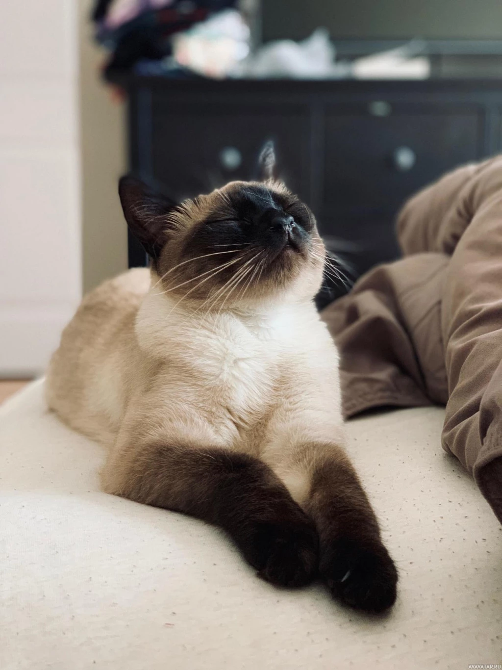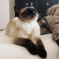На картинке изображена сиамская кошка, лежащая на кровати. Кошка кажется расслабленной и комфортной, с головой, повернутой вверх, как будто она улыбается или наслаждается чем-то приятным, происходящим сверху. У кошки отличительные голубые миндалевидные глаза и темные полосы вдоль тела. Окружающая среда предполагает домашнюю обстановку, вероятно, чей-то дом.