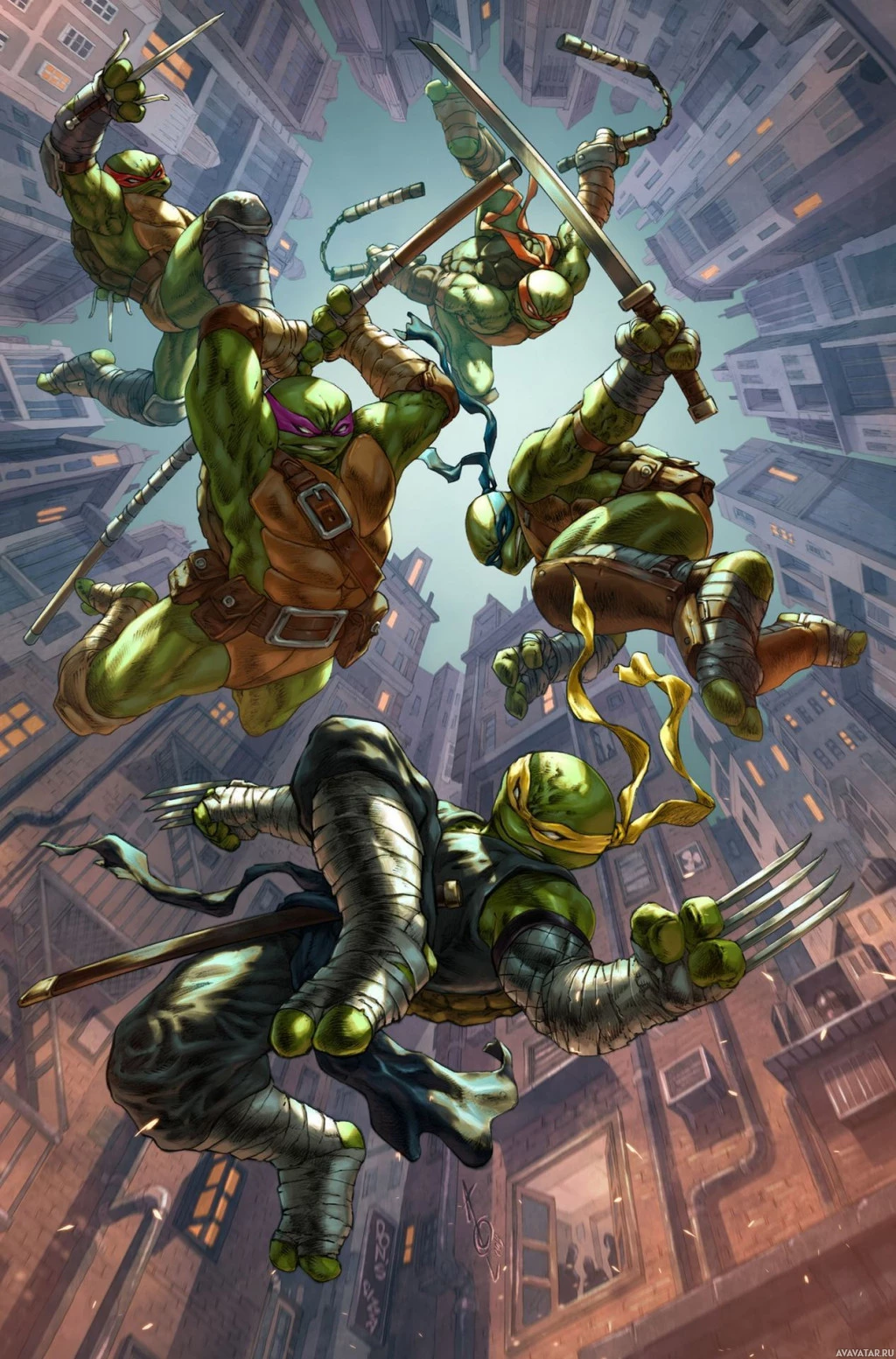 character on the left is Donatello, recognizable by his purple mask and weapon. The character on the right is Raphael, identifiable by his