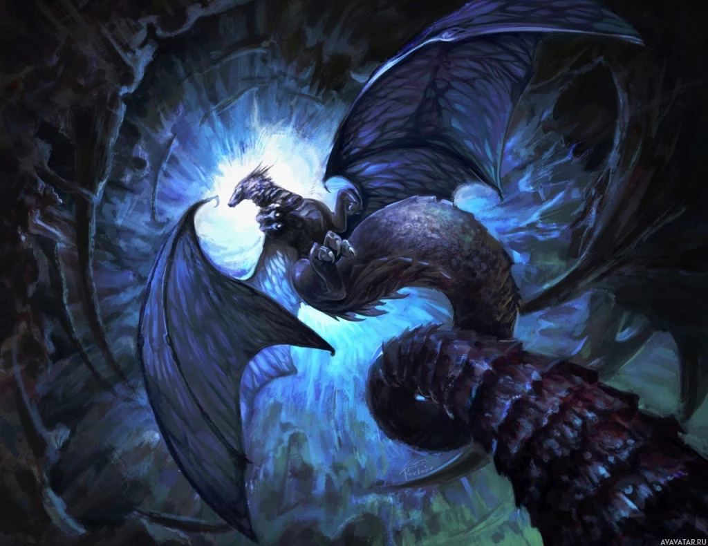 a mystical atmosphere, possibly indicating that they are engaged in some sort of battle or confrontation within a magical or mythological setting. The artwork is detailed, showcasing elements of fantasy art and dragon-