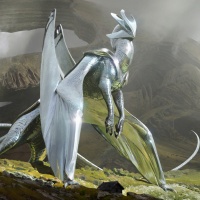 large wings and a tail resembling a serpent's. The environment around the creature is rocky and appears to be in