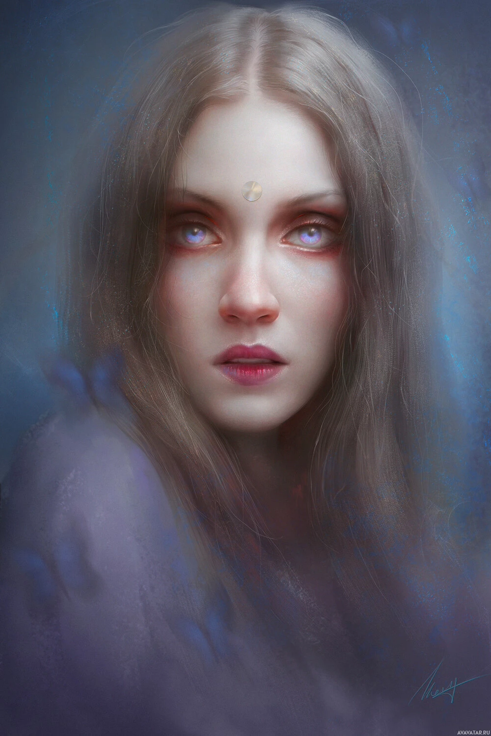 На картинке изображен портрет девушки с длинными, плавными волосами. У нее вдумчивое выражение, и ее глаза смотрят в сторону от зрителя, что придает ей интроспективный или созерцательный вид. Есть художественное прикосновение к изображению, с размытым фоном, который усиливает фокус на ее лице. Цветовая палитра мягкая и пастельно-подобная, способствующая общей нежной и эфирной атмосфере портрета.