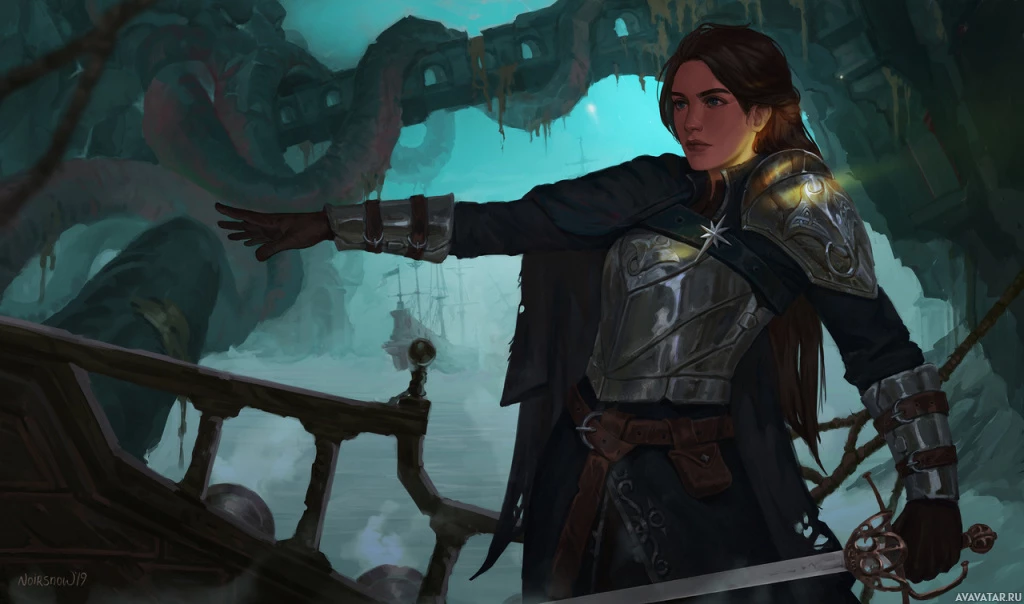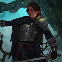The image features a character depicted in an illustrative style. She is wearing armor and carrying a sword, suggesting that she might be from a fantasy or