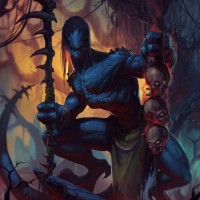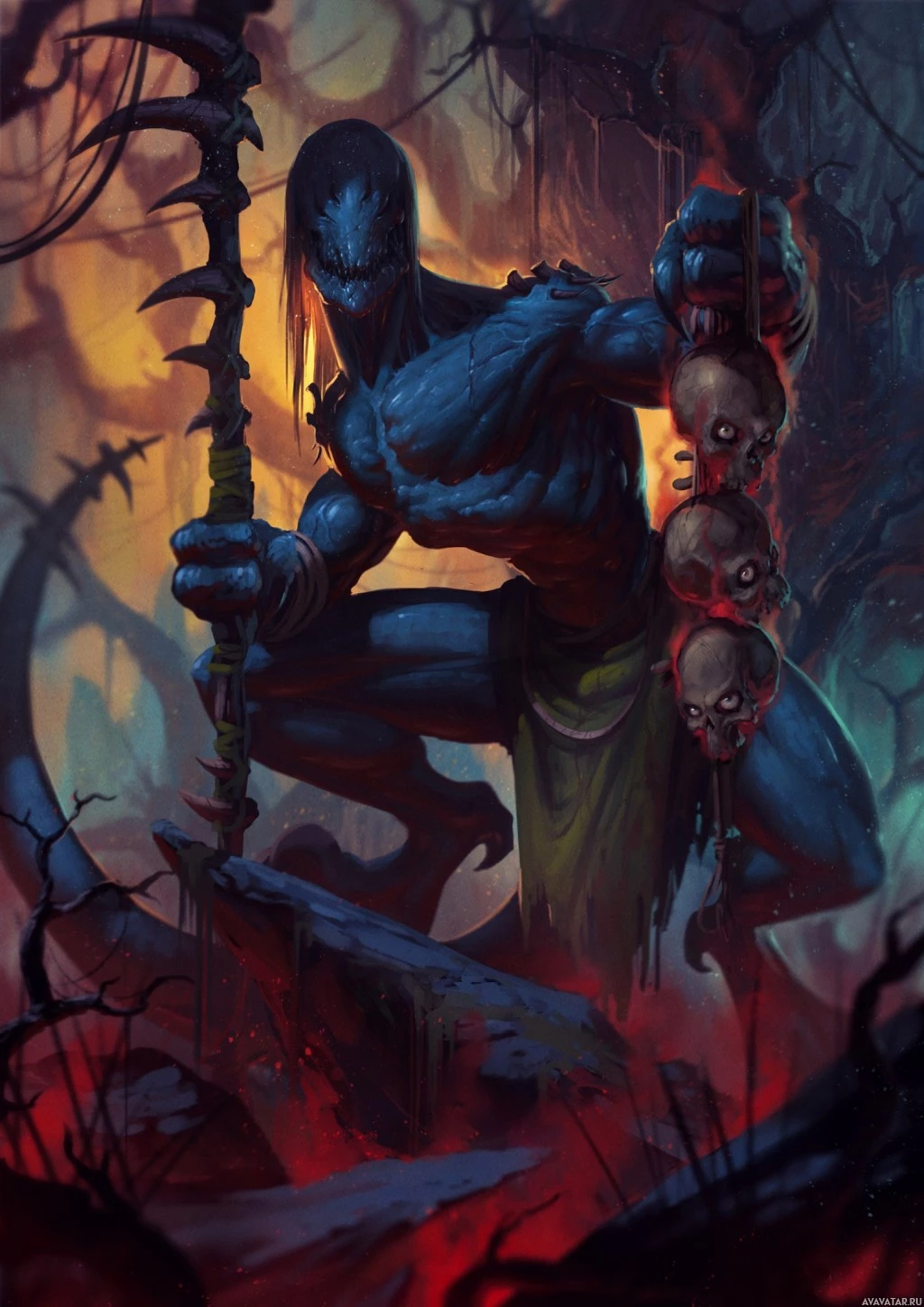 blue skin and is holding a staff with a skull at the top, which adds to its ominous appearance. Surrounding this central figure are numerous
