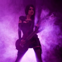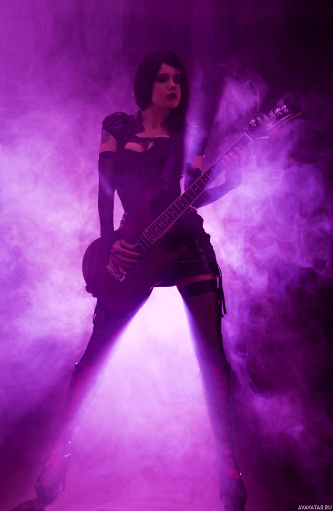 an electric guitar, indicating her role as a guitarist. The background features smoke or a similar