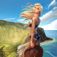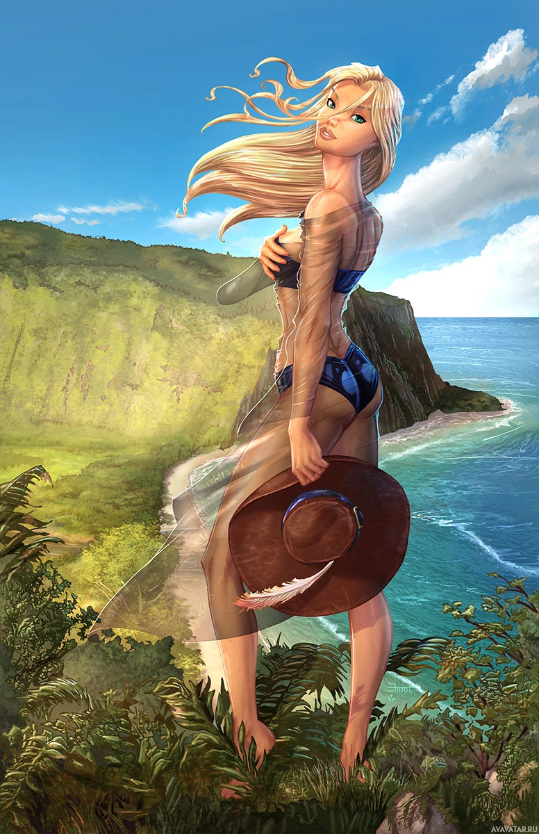 bikini top and holding a hat, which suggests a beach or vacation setting. The overall atmosphere of the image is serene and picturesque, typical of fantasy or adventure artwork.