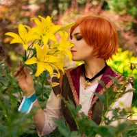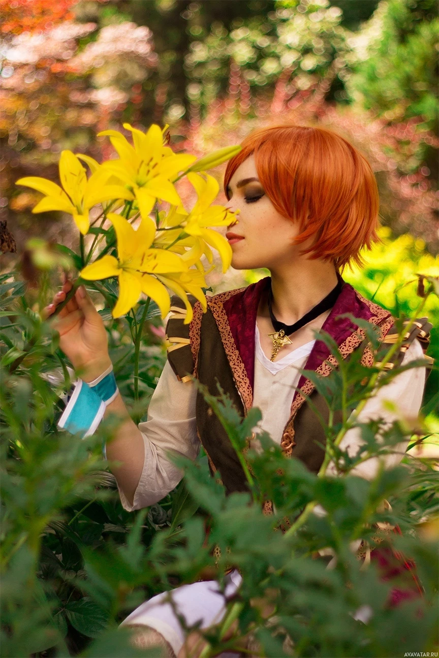 In the picture, there is a person who appears to be cosplaying as Shani from "The Witcher" game. They are sitting among yellow flowers with green foliage, and their attention is focused on smelling one of