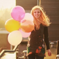 The picture features a woman with blonde hair, smiling as she carries several balloons. It appears to be taken during sunset or golden hour, given the warm lighting. She is standing on what looks like a rooftop or an elevated outdoor space.