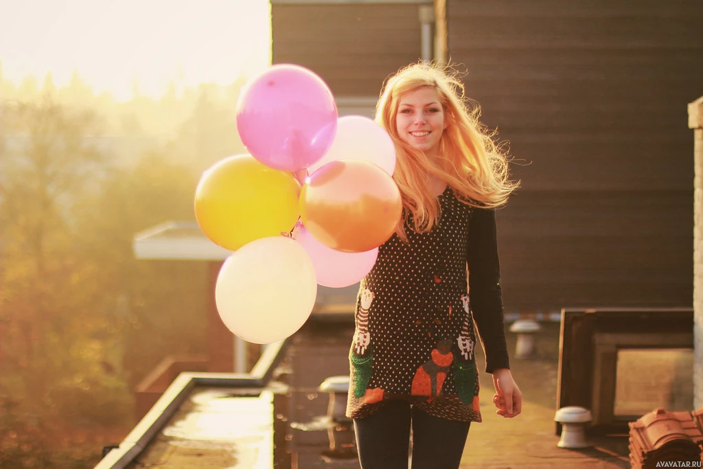 На картине изображена женщина со светлыми волосами, улыбающаяся, когда она несет несколько воздушных шаров. По-видимому, он принимается во время заката или золотого часа, учитывая теплое освещение. Она стоит на том, что выглядит как крыша или возвышенное открытое пространство.