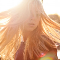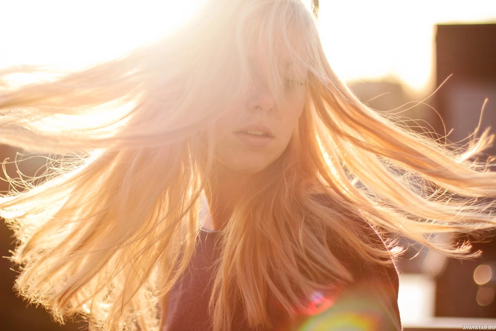 a blonde woman with her hair blowing in the wind, suggesting it might be during sunset or sunrise due to the warm, golden light. She appears to be walking away from the viewer and is wearing some