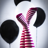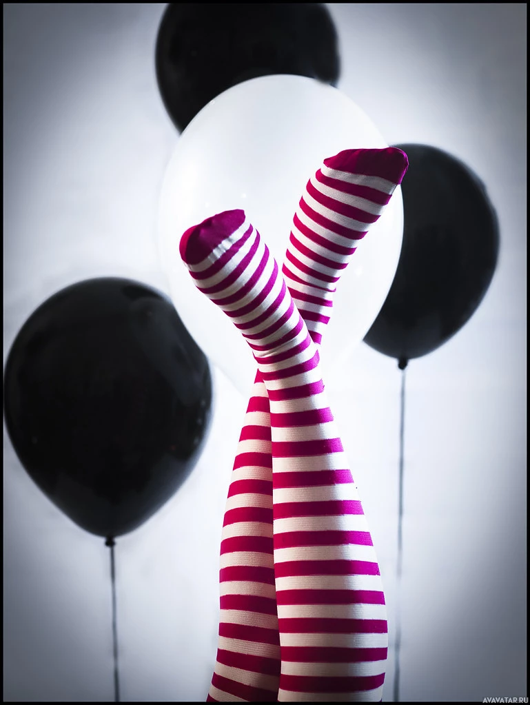 striped socks on someone's feet, standing in front of balloons. There is also what appears to be a person's legs crossed and wearing the same pattern of striped socks, creating