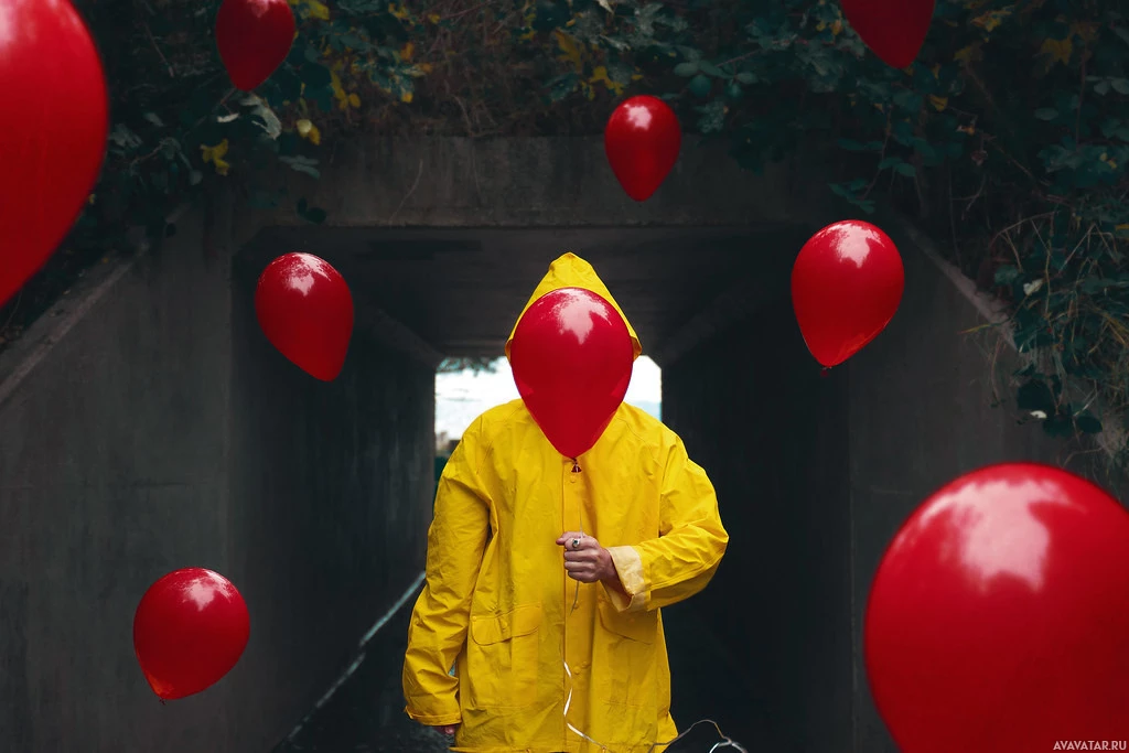 На картинке изображен человек, одетый в желтый плащ, стоящий в подземном туннеле или канализации. Над человеком плавают многочисленные красные воздушные шары, создающие необычный и несколько сюрреалистический визуальный эффект. Капюшон пальто скрывает часть лица человека, добавляя ощущение анонимности или таинственности.