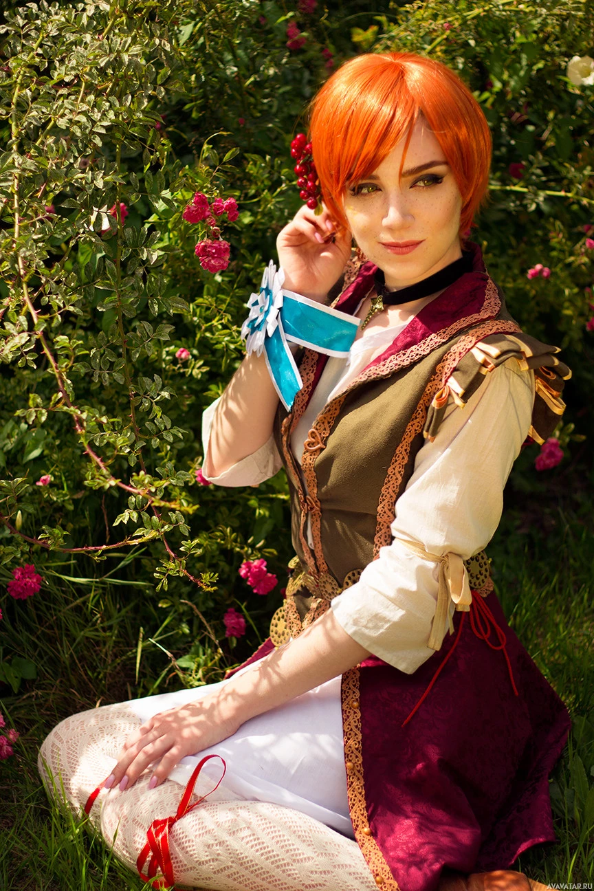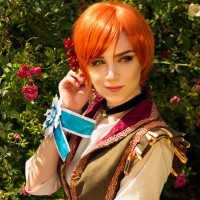 the video game "The Witcher 3: Wild Hunt." The individual is wearing a costume with a combination of brown and red colors that includes a vest, trousers, gloves, and boots. There are also accessories such as a bow adorned with blue feathers and a headband with