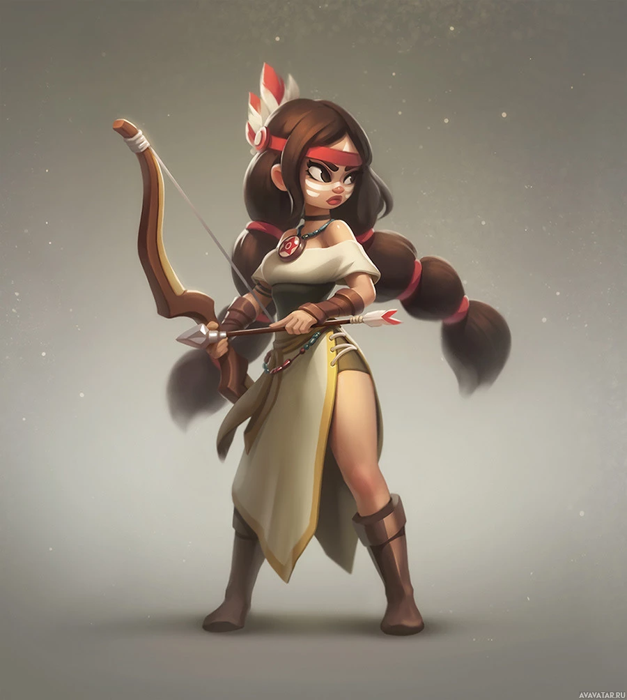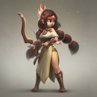 a girl character. She is wearing a dress and has braided hair. She is holding a bow in one hand and an arrow in the other, suggesting she might be in