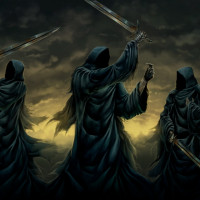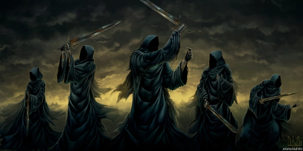 hooded cloaks and wielding weapons, which gives them a menacing appearance. The setting appears to be dark and ominous, fitting the nature of these