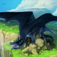 The image features a fantasy-style dragon. It has large wings, sharp teeth, and is perched on an overhang with greenery below. The background suggests a natural setting, possibly at the edge of a cliff or a ledge overlooking a valley.