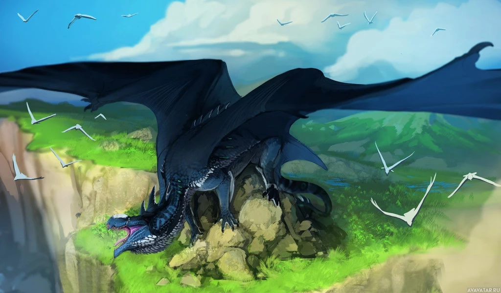 На картинке изображен дракон в стиле фэнтези. Он имеет большие крылья, острые зубы и расположен на свесе с зеленью внизу. Фон предполагает естественную обстановку, возможно, на краю скалы или выступа с видом на долину.