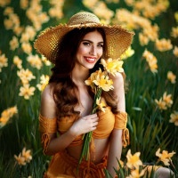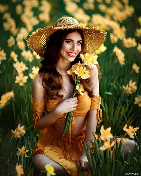 a straw hat and a yellow crop top, which complements the vibrant flowers around her. The woman has