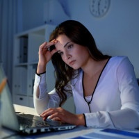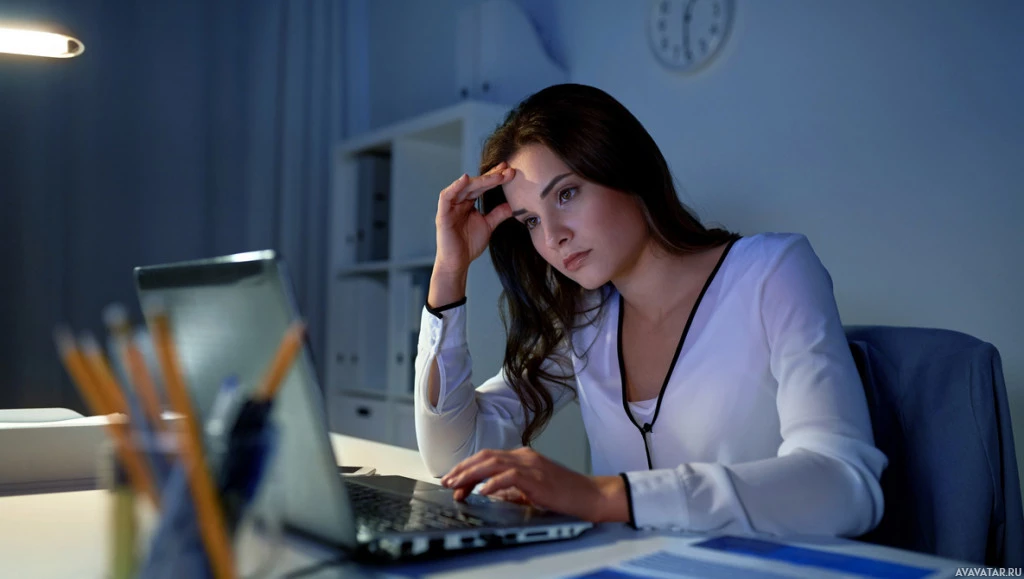 In the picture, there is a woman who appears to be sitting at a desk with her laptop. She has a concerned or troubled expression on her face and is touching her forehead with her hand, possibly indicating that she is stressed or thinking deeply. The setting looks like