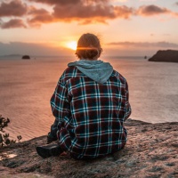 a body of water at sunset. The individual appears to be in contemplation or enjoying the view, with their back towards the viewer, obscuring any details about them except for their general outline. The setting is peaceful and serene, with