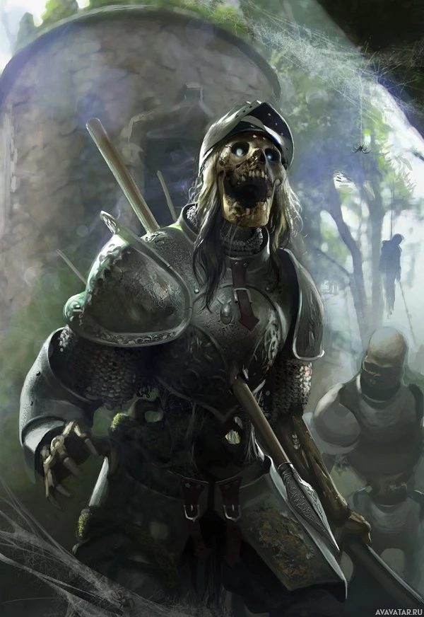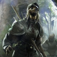 wooded area, with trees and mist in the background, which gives it an eerie and mystical atmosphere. The armor and weapon suggest a historical or mythological setting, possibly related to medieval legends or folklore about