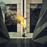 a flaming object or torch with fire emanating from it, which is being directed towards the camera. They appear to be wearing some form of