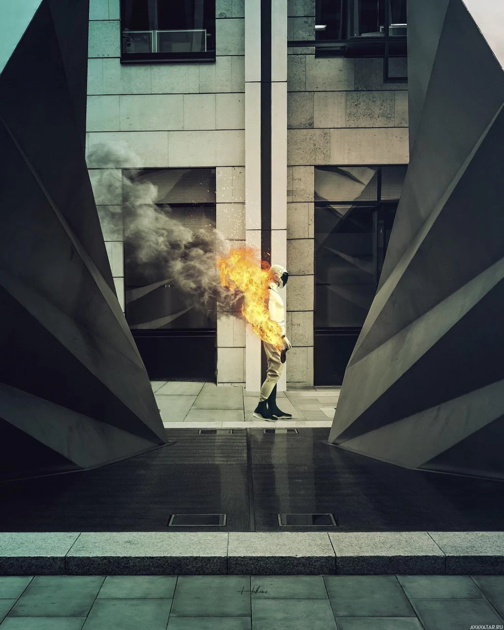 protective gear, possibly a helmet, which could imply a safety concern due to the proximity to the flame. The overall atmosphere suggests a blend of