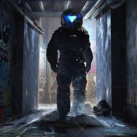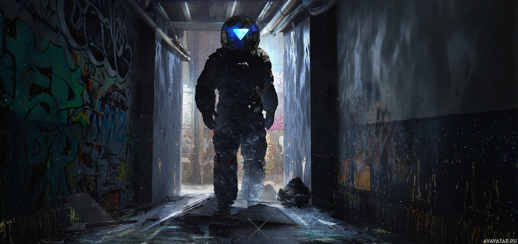 На картинке изображен человек, одетый в скафандр, стоящий в подземной или промышленной обстановке с граффити на стенах. Человек смотрит в сторону камеры и держит руки по бокам. Окружающая среда испускает антиутопическую или постапокалиптическую вибрацию из-за ветхого состояния структур.