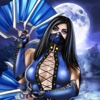 a full moon and misty landscape, which suggests the setting could be an otherworldly or mystical place common to Mortal Kombat's fantasy elements. The character is known for being part of the series' storyline and its