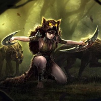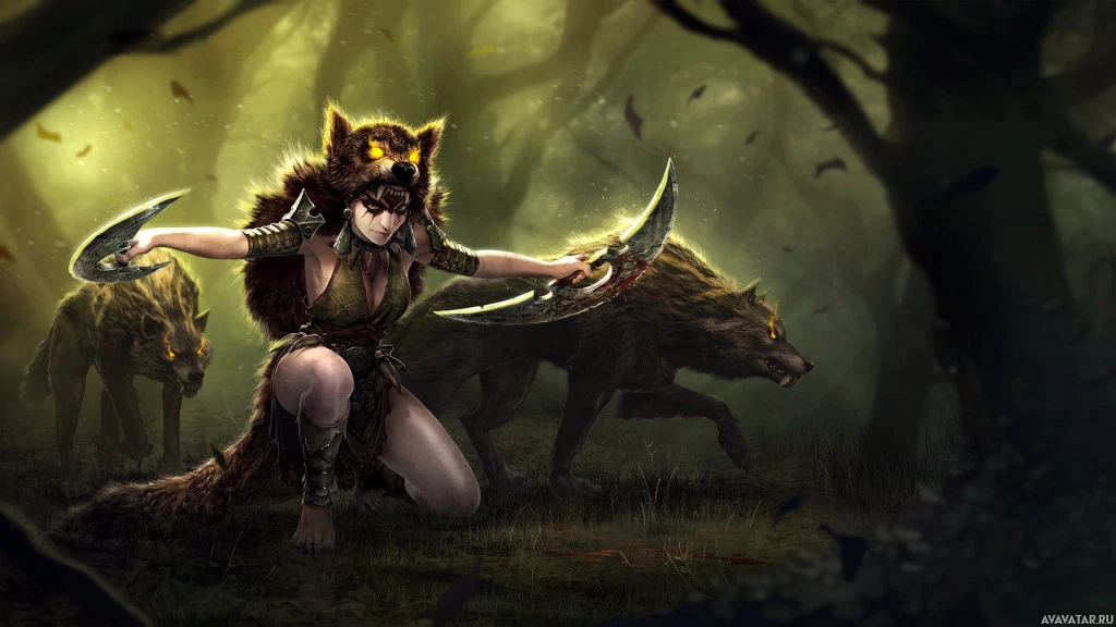 animalistic attire that resembles a wolf's fur and with an expression that suggests she is fierce or focused. She is holding what appear to be claws or weapons in each hand and stands on her