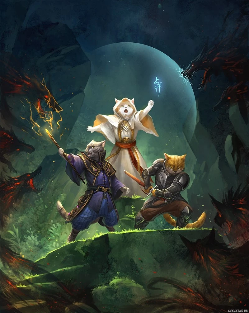 a fantasy scene featuring three characters: a cat with what appears to be magical or mage-like attire, another character that resembles a wolf or werewolf in similar magical garb, and a third figure that seems to be a human female dressed as a sorcerer or mage. They are set against a dramatic backdrop with elements like floating rocks and energy emanations from the characters' hands, suggesting they possess some kind of