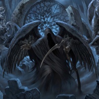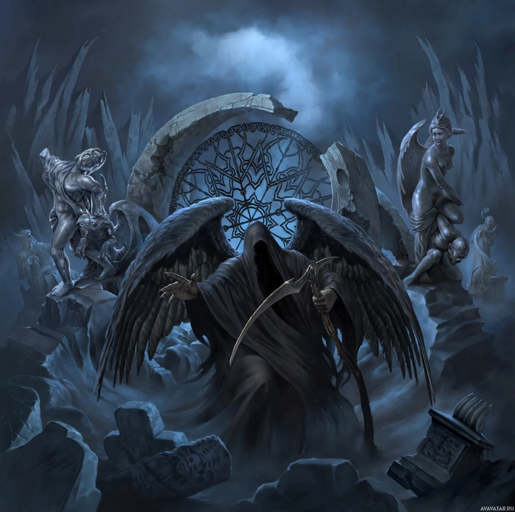 mythological creatures that could be interpreted as angels or demons, with one prominently holding a scythe, which is often associated with harvesting lives. The background features