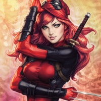 a female character with red hair, wearing a costume that includes a black and red bodysuit. She is also holding two swords crossed behind her back, which is characteristic of the Deadpool persona in
