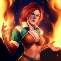 the video game "The Witcher 3: Wild Hunt," specifically Triss Merigold, portrayed as a witch with red hair and green eyes. She is wearing a medieval-style outfit that includes a bodice, corset, and pants, along with a belt and armor. The background features flames and