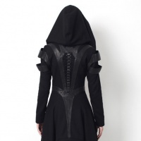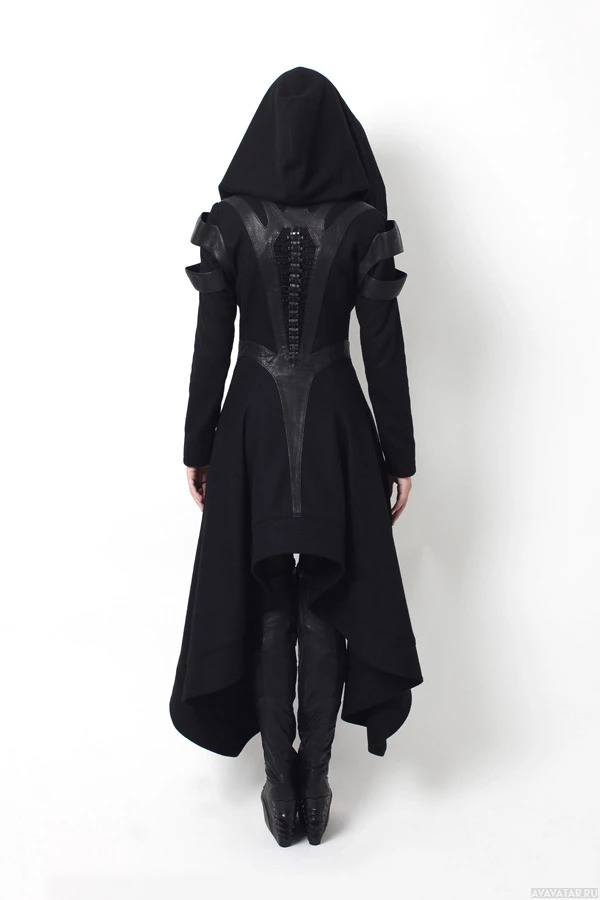 a black cloak with hood. The style of the garment suggests it could be inspired by fantasy or