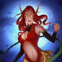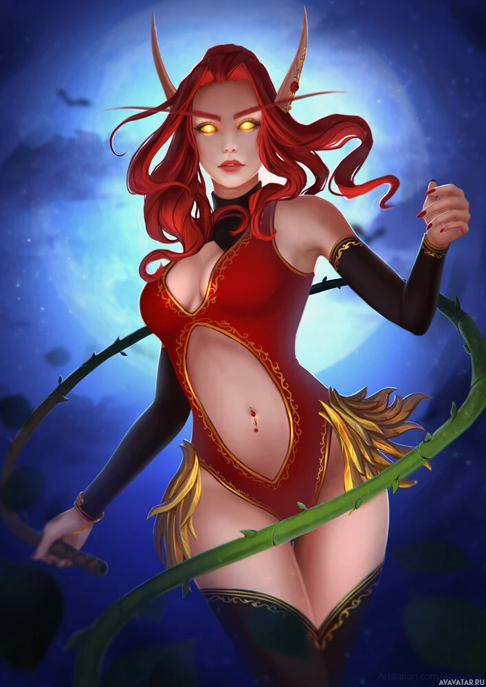 fantasy character with red hair, wearing an elven outfit that includes a corset top and what appears to be armor or leather clothing. She is holding a bow and appears to be in the act of shooting an arrow, suggesting she might be an archer or hunter within this