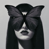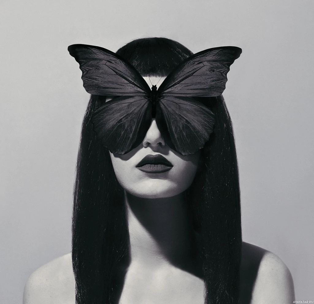 black butterfly positioned over her face, covering both eyes. This creates a visually striking contrast between the realistic
