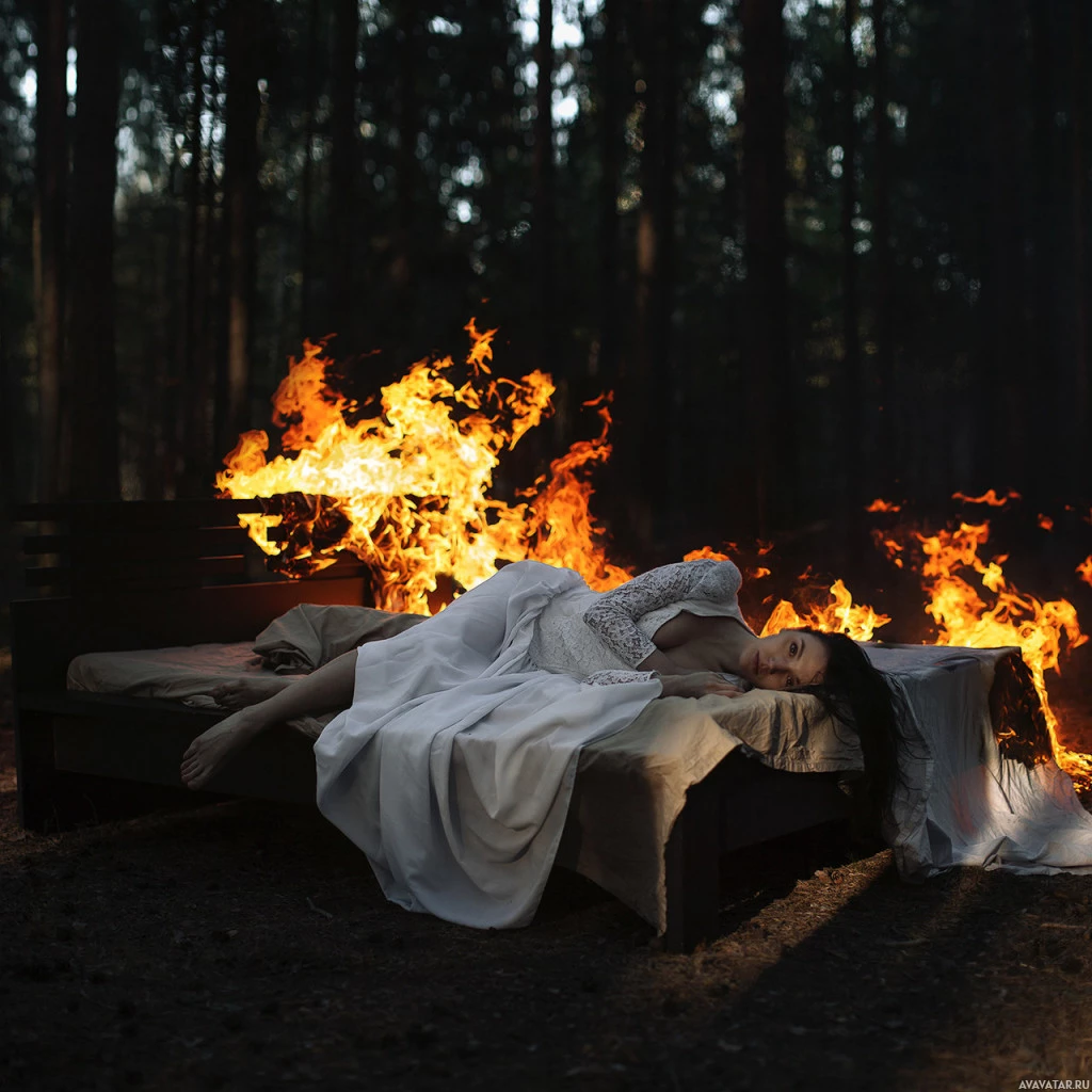 trees in the background. There are flames nearby, suggesting fire, which adds a dramatic or intense atmosphere to the scene.