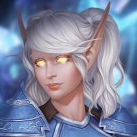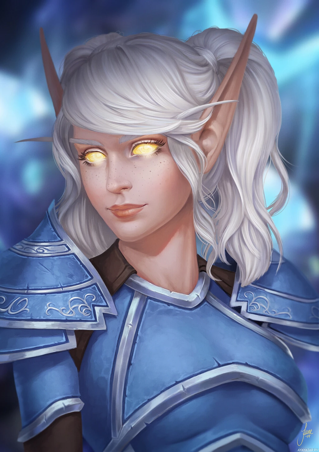 blue tones that complement her white hair and armor color scheme. This image appears to be related to the "Warcraft" series, which is a popular