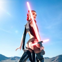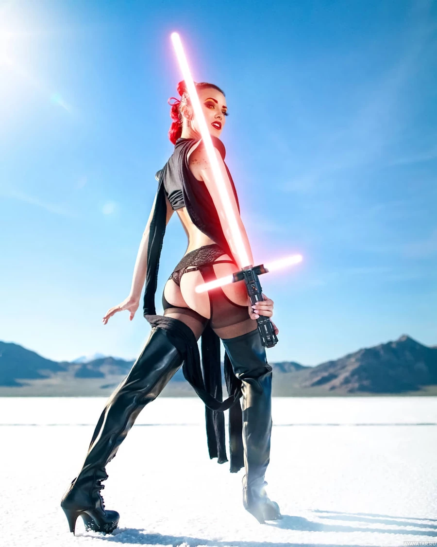 a black bikini-like top with golden accessories and chains, paired with knee-high black boots. The person is also holding a lightsaber in their right hand, which is