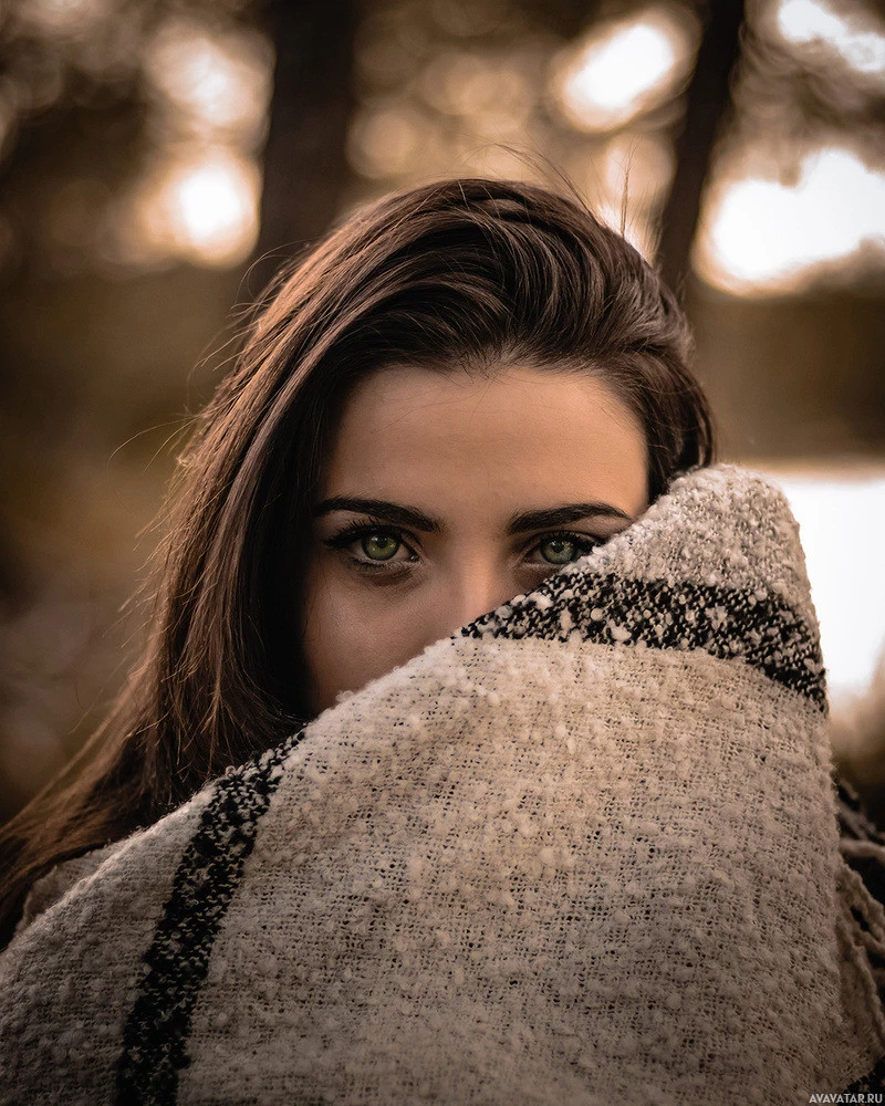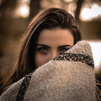 The picture features a woman, who appears to be a brunette. She is seen from the chest up and has her head turned slightly away from the camera with one hand covering part of her face. It looks like she may be outdoors during twilight or early evening given