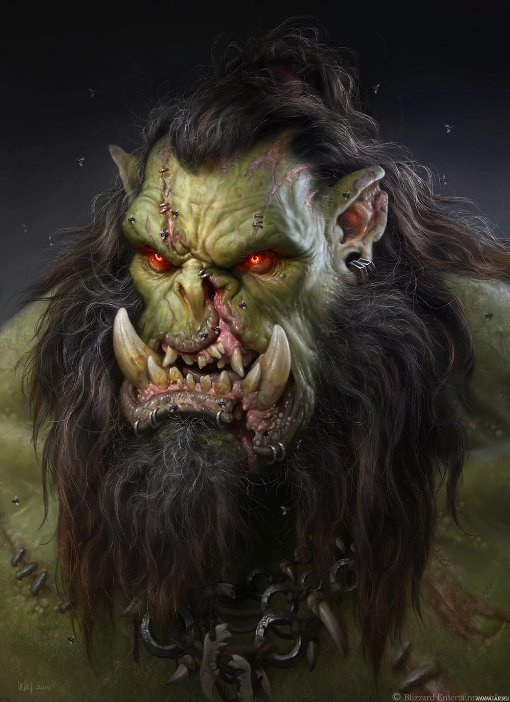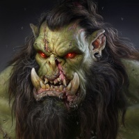 red eyes, and a fierce demeanor. The orc is wearing what seems to be