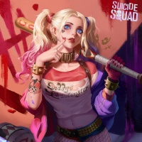 an urban environment that could be part of a Suicide Squad scene. The art style is detailed and vibrant, capturing the playful yet intense nature of Harley Quinn's character.